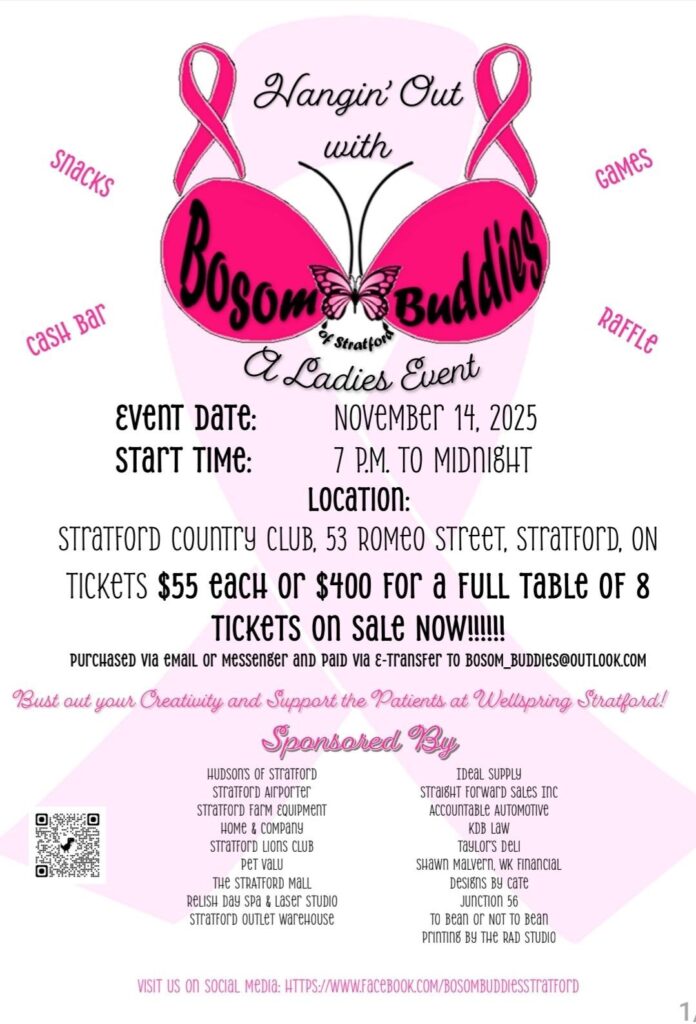 Kate: Always a pleasure chatting with Leah Morgan, organizer with Bosom Buddies of Stratford. Hanging Out with the Bosom Buddies is coming up on November 14th at the Stratford Country Club, a fun ladies’ night out for Wellspring Stratford! Leah has details (photo: Bosom Buddies Stratford FB page):