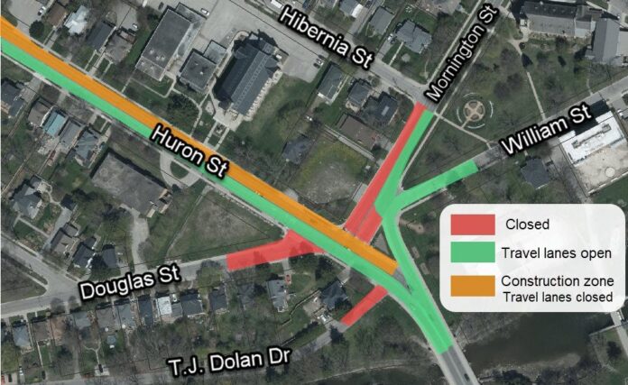 Beginning Monday, Mornington Street will be closed between Hibernia Street and Huron Street with the intersections of Huron and T.J. Dolan Drive and Huron and Douglas Street also closed.